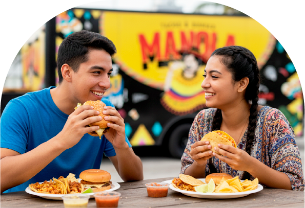 Desde el centro hasta el Doral, pasamos días enteros girando por Miami. Cada quien en su puesto, con calor, ruido y rica comida en la mano. Somos locales, somos reales y amamos ver cómo te comés todo lo que preparamos.